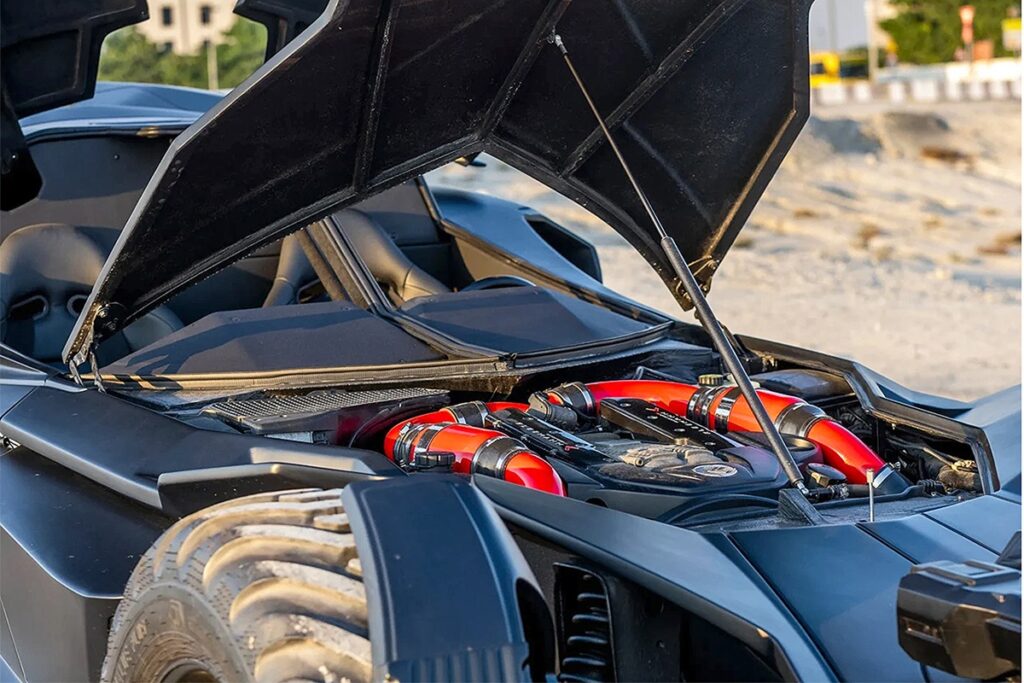 これは単なるショーカーではない。このバットモービルは(もちろん機関銃を除いて)完全に走行可能だ。ボンネットを開けると、CL 55 AMG由来のメルセデス製スーパーチャージャー付きV8エンジン(M113K)が姿を現す。さらにこの個体では、デンマークのスペシャリストであるKleemannによってチューニングが施され、出力は約600馬力に達するとされる。