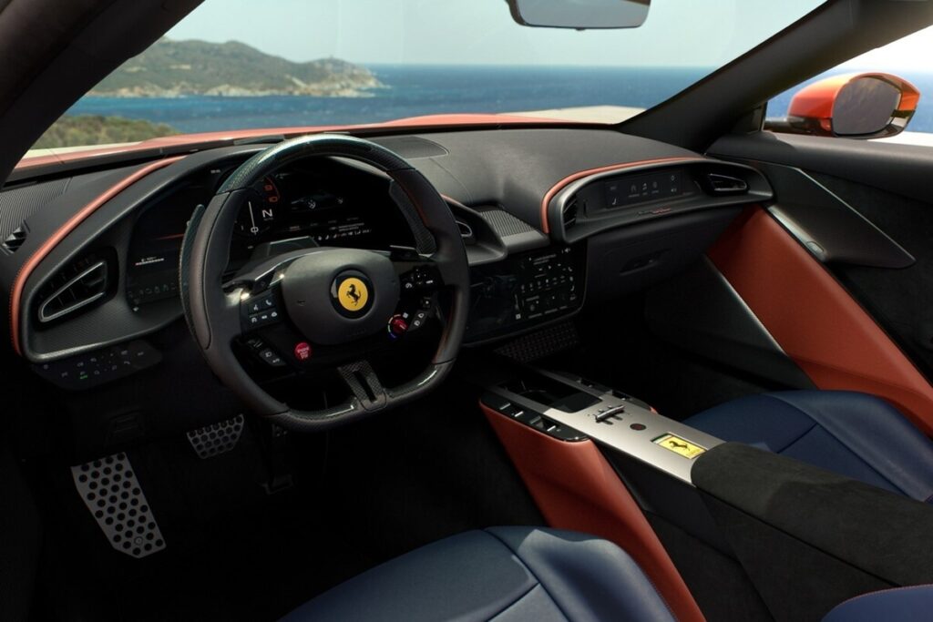 コックピットでは、フェラーリは高品質な素材、デジタル計器、触感に優れたボタンを採用した、ドライバー志向のレイアウトを採用している。その中心となるのは3つのディスプレイだ。15.6インチのコンビネーションメーター、10.25インチのインフォテインメントシステム、そして8.8インチの助手席用ディスプレイである。後部には小さな「非常用シート」が設けられており、これによりスパイダーは依然として2+2モデルとしての資格を維持している。