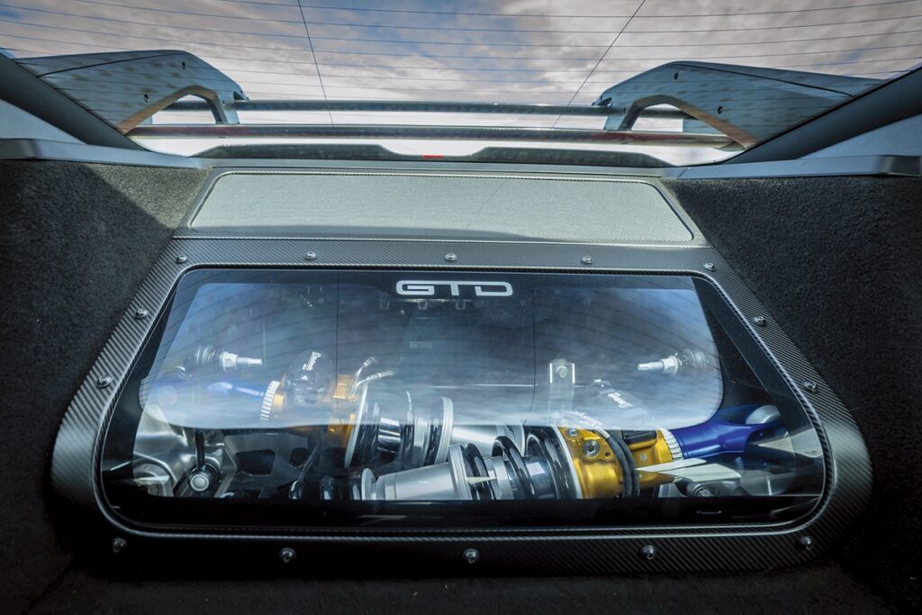 とりわけ、カーボンファイバーのボディの下には純粋なレーシング技術が存在する。カップRタイヤはマグネシウムホイールに装着され、その内側にはカーボンディスクが配置される。そしてマルチマティック製サスペンションは油圧制御ダンパーを備え、「GTD」を実質的にアスファルトへと貼り付ける。