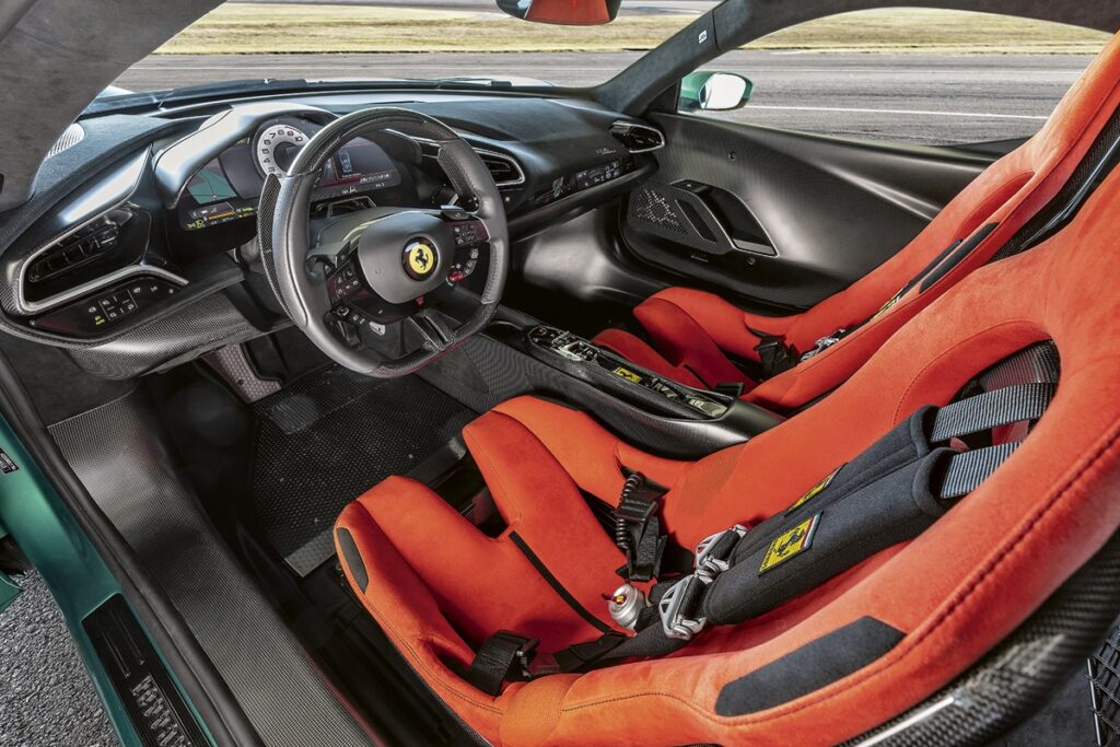 室内は徹底的に削ぎ落とされ、グローブボックスは廃止。カーボン主体の内装により、バケットシートは「296 GTB」比で5kg軽量化されている。