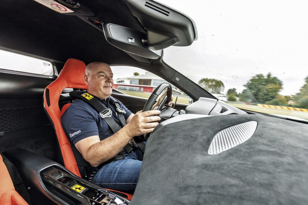 コーナー間では100km/hから250km/hへ一気に加速し、また減速。「SF90」由来の新しいeブーストがさらに加速感を強める。そして、この3kmのコースでは60kgの軽量化効果を特にブレーキング時に強く実感できる。コーナー出口ではトラクションコントロールがわずかなオーバーステアを滑らかに抑え、新しいCup 2タイヤは驚くほど高いグリップを発揮する。すると無線から再びファブリツィオの声が入る。「ギド、クールダウンラップだ、ピットへ!」―簡単に言うが、それが難しい。
