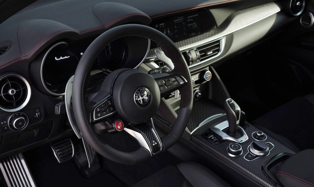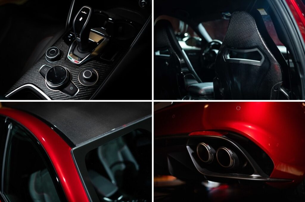 ジュリアにはさらに専用装備としてカーボンルーフを採用。加えてAkrapovic製エキゾーストシステムを装着し、チタン製マフラーとカーボンフィニッシャーにより軽量化と排気効率を向上。乾いたサウンドがドライビング体験を強く刺激する。