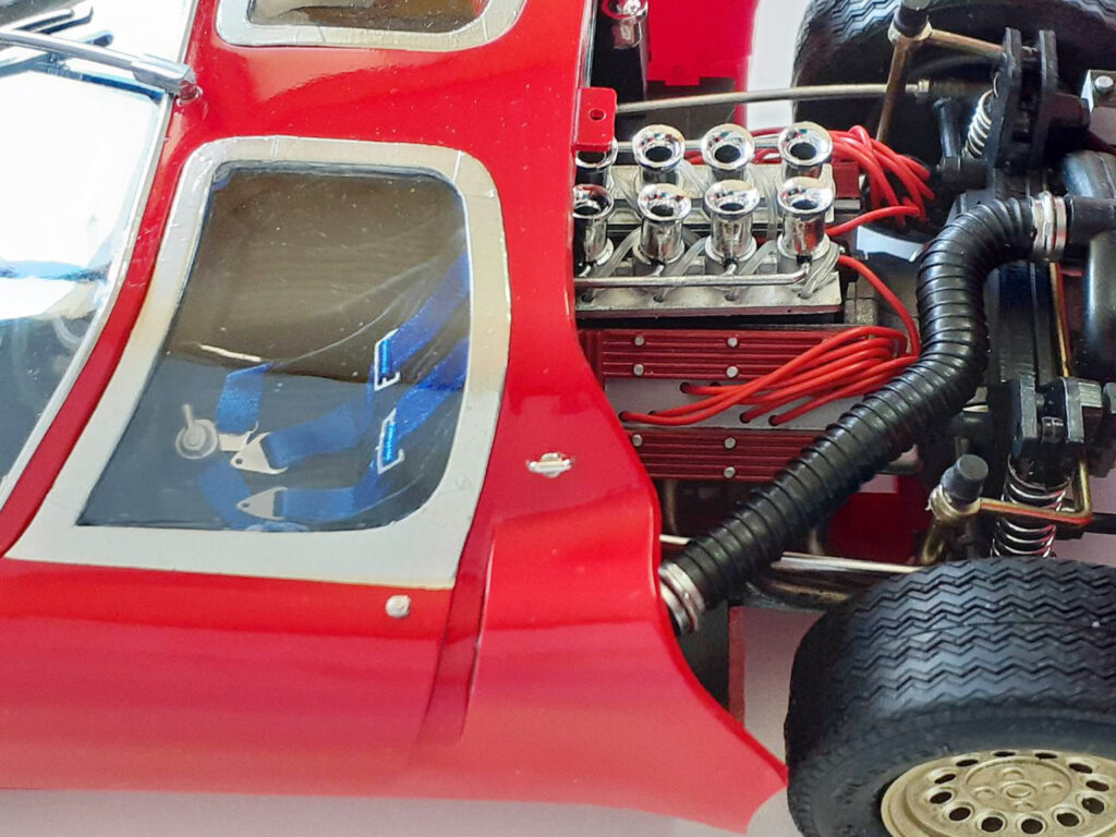 ボディは主に3分割されたカウリングなのでなかなか定位置に固定出来ず、しかもドアやリアのカウリングは可動式なので悪戦苦闘させられた。接着して固定してしまう選択肢もあったが、やはり完成後もミッドシップされたエンジンを鑑賞したいものだ。