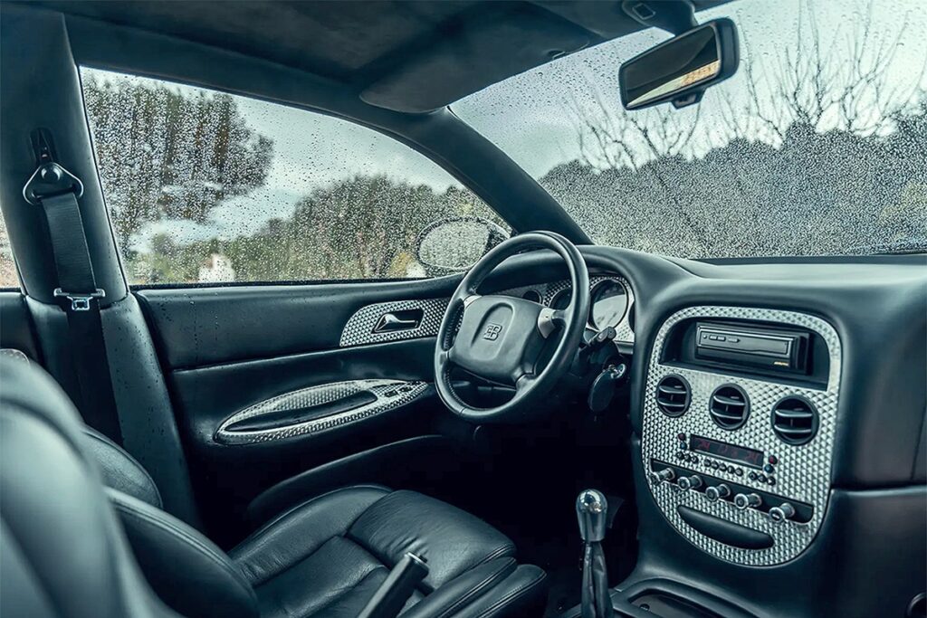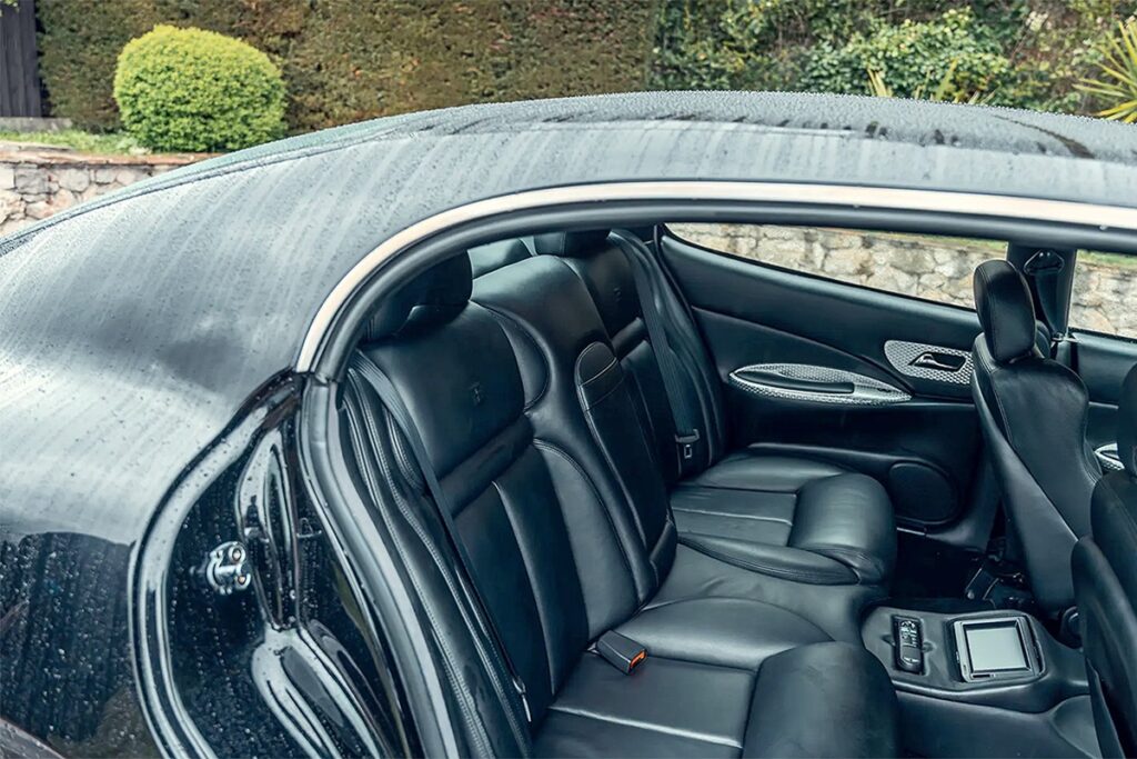 インテリアはブラックレザーとアルミニウムが基調。4座すべてのシートにはEBロゴが刻印され、後席にはほぼ水平に設置された小型テレビも備わる。一部の専門家は、そのディテールに後のヴェイロンの萌芽を見出している。