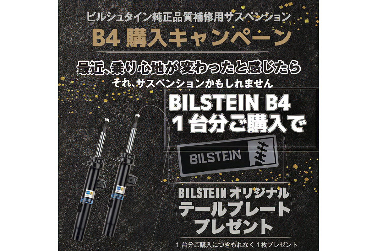 期間中、BILSTEINの純正品質補修用サスペンション「BILSTEIN B4」1台分購入えd、もれなくBILSTEINオリジナルテールプレートを1枚プレゼント。ただし、数量限定のため、なくなり次第キャンペーンは終了となる。