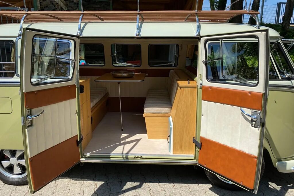 キャンピングコンバージョンは、このクラシックモデルの魅力をさらに高めている。4座席に加え、就寝スペース、そして典型的なVWバスのレイアウトにより、週末の“動く住まい”へと変貌する。