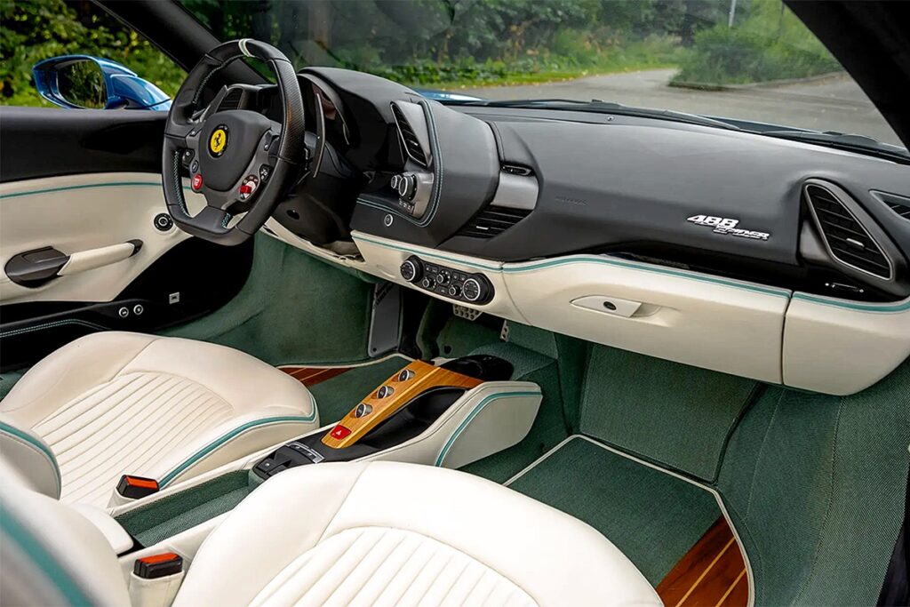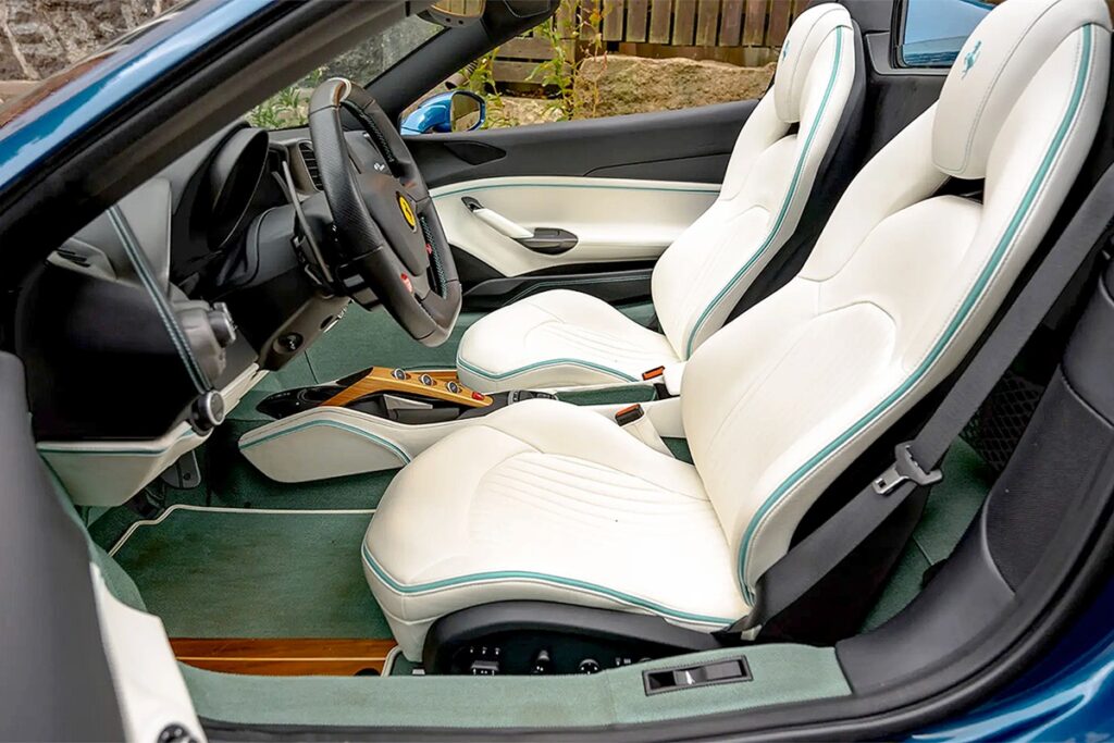 しかし、このユニークな仕様を詳しく見てみよう。「ブルー キアロ メタリッツァート」のボディカラーが海を彷彿とさせる雰囲気を醸し出し、フロントスプリッター、サイドスカート、リアスカートの一部は「ビアンコ キング」でアクセントが付けられ、「ブルー ティファニー」の控えめなコントラストストライプで装飾されている。さらに、青いホイールキャップや、フロントフェンダーに特徴的なスクーデリアのエンブレムを省略するなど、小さくも洗練されたディテールが随所に施されている。