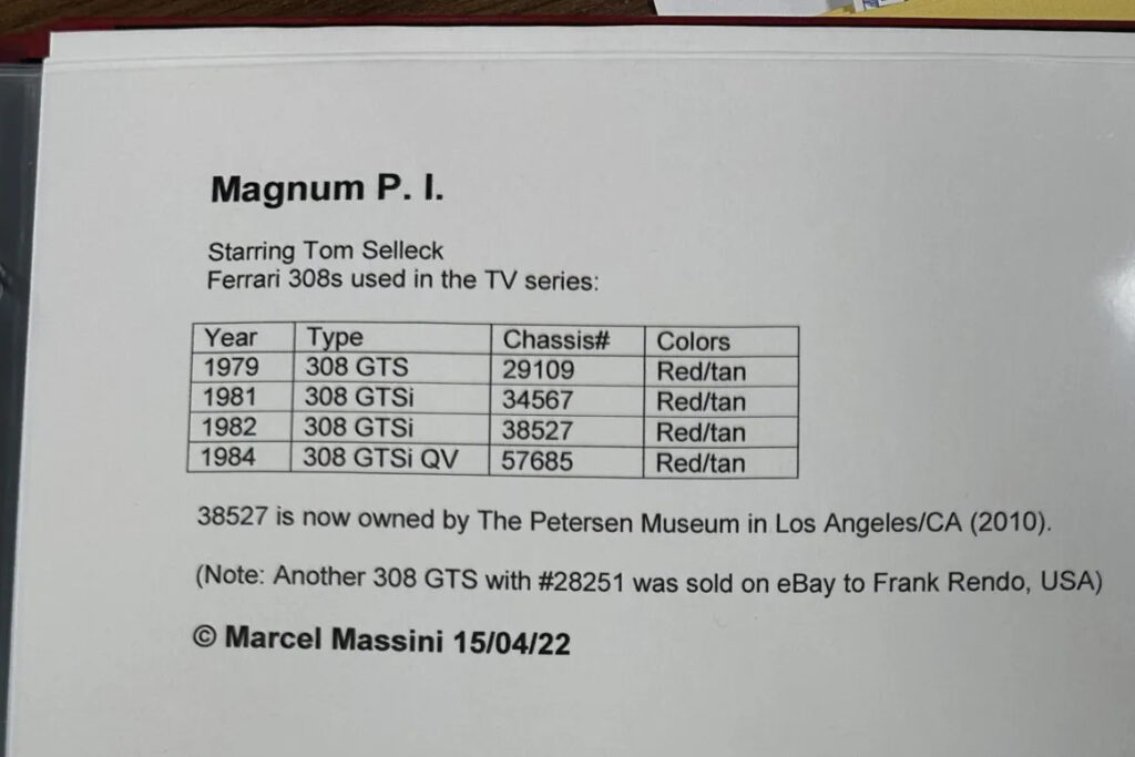 彼によれば、広告に掲載されている車のシャシー番号は「28251」で終わっているという。これは、制作会社が『マグナム』で使用したと思われる9台の「フェラーリ308」のうちの1台と同じ番号だ。