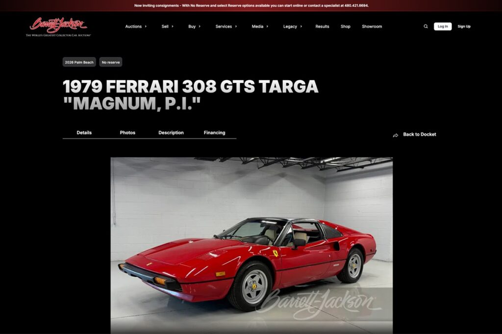 オークションハウス「バレット ジャクソン」が、テレビのカルトシリーズ、『私立探偵マグナム(Magnum, P.I.)』に登場したとされる、このフェラーリ308 GTSを出品した – 本物の「私立探偵マグナム」カーなのか、それとも偽物なのか?