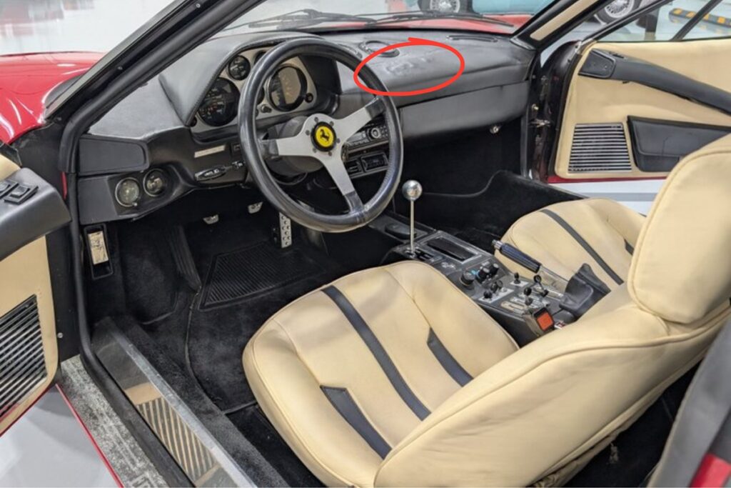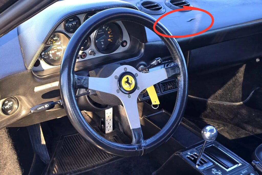 最も重要な写真はコックピットの写真だ: 「bringatrailer.com」で競売にかけられたフェラーリでは、ダッシュボードの通気口下部の中央に、短く幅の広いひび割れがある。「バレット ジャクソン」が競売にかけるフェラーリでも、この部分の表面は同様に異常が見られるが、「bringatrailer.com」の車両とは異なり、広範囲に膨れ上がっている。また、幅の広いひび割れは確認できない。