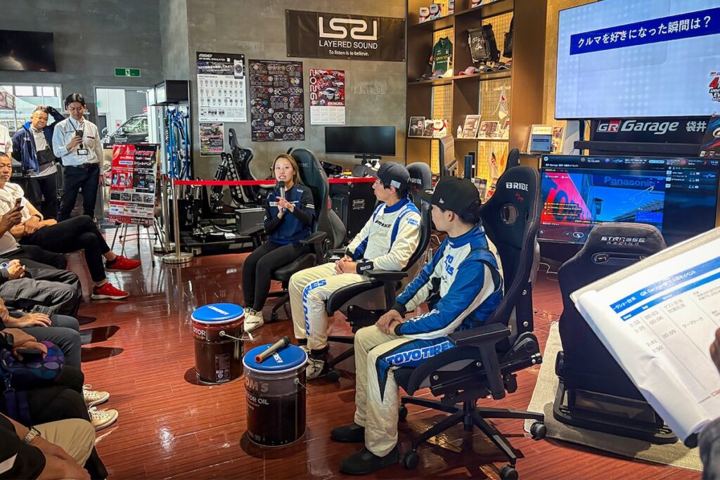 トークショーのメンバーは、2025年度より「TOYO TIRES with Ring Racing」のドライバーとしてドイツ・ニュルブルクリンクの耐久レースに参戦し、2026年4月11日~12日に開催されたSUPER GT開幕戦では日本人女性ドライバー初の表彰台を獲得した小山美姫選手、2022年からスーパーGT300にて活躍し、2025年はSUPER GT最終戦もてぎでGT300クラス優勝を達成した塩津佑介選手、さらにEモータースポーツ世界チャンピオンであり、TOYO TIRE社員ドライバーの宮園拓真選手の3名。MCは元レーシングドライバーで、イベントMCとしても活躍する鈴木学氏が担当した。
