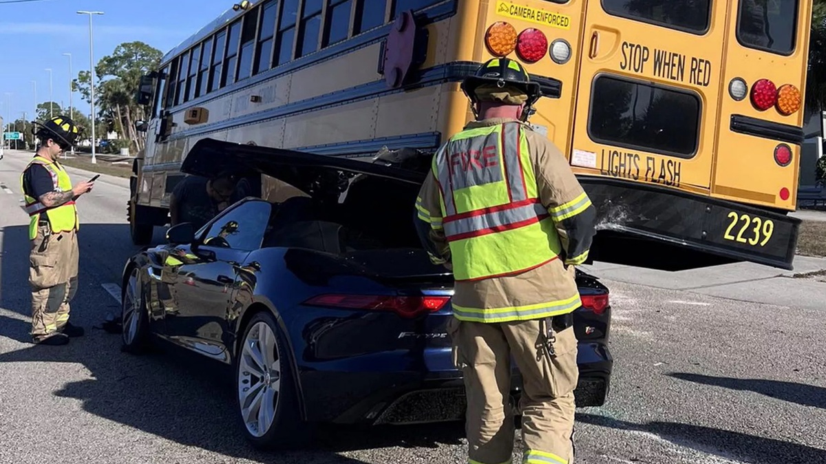 【クラッシュ!】オーマイガー!ジャガーFタイプが高速走行のまま減速せずにスクールバスの真下に突っ込んだ!幸い乗員は軽傷で済んだ 動画付き