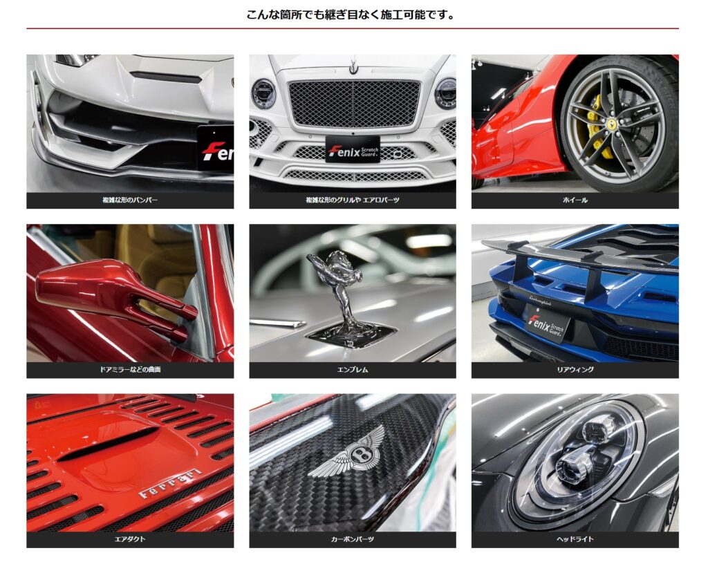 「Fenix ScratchGuard」は、塗装作業と同様、バンパーは脱着し、コーナーセンサーやランプ、グリルやパネル・その他外装品などを取り外して施工しますのでボディー表面に元の塗装とプロテクションフィルムの段差や切れ目が生じません。