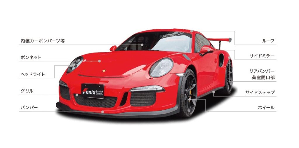 「Fenix ScratchGuard(フェニックス スクラッチガード)」は撥水性や防汚性能にも優れてており、事故などにより鈑金塗装が必要になった場合やお車の売却時には剥がすこともできます。